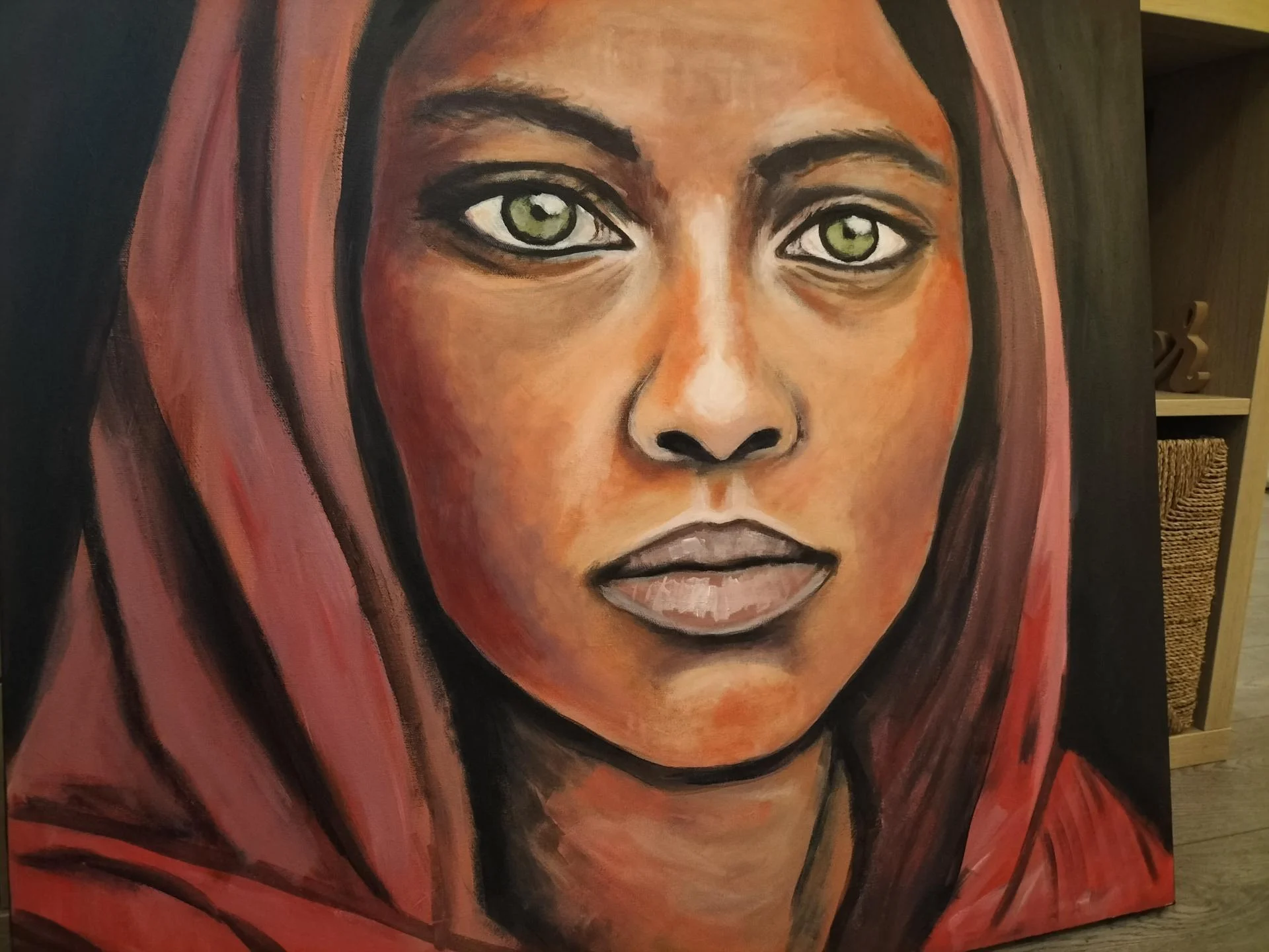 Je termine l'année avec ce portrait d'une femme indienne aux yeux verts, portant un voile rose, au format 80x80cm, à l'acrylique sur toile.