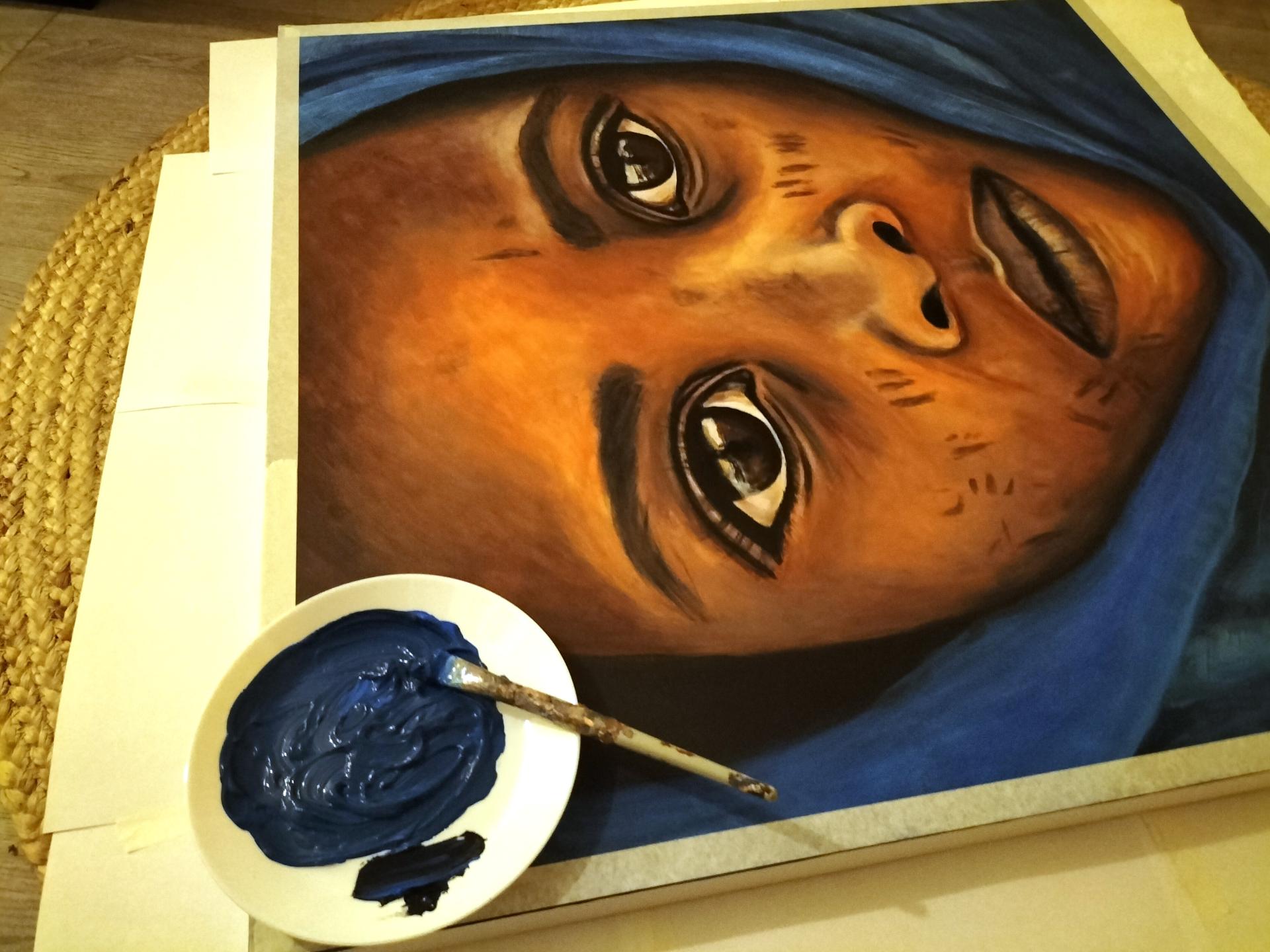 Sur ma dernière toile, "Enfant Mbororo", j'ai choisi de peindre la tranche en bleu foncé uni.